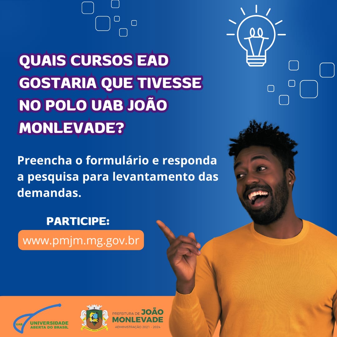 A Secretaria Municipal de Educação, em parceria com o Polo de Apoio Presencial da Universidade Aberta do Brasil (UAB) João Monlevade, lançou um formulário de pesquisa de demanda online, visando a expansão da oferta de cursos na modalidade de Educação a Distância (EAD) no município.