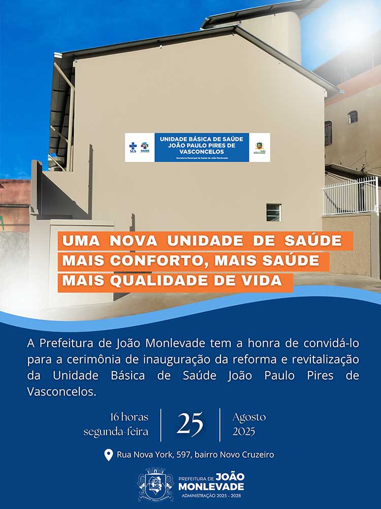 O Prefeito de João Monlevade, Dr. Laércio José Ribeiro, e a vice-prefeita, Dorinha Machado, convidam Vossa Senhoria para a inauguração da Reforma e Revitalização da Unidade Básica de Saúde João Paulo Pires de Vasconcelos.
