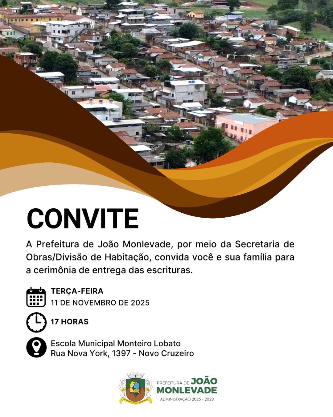 A Prefeitura de João Monlevade, por meio da Secretaria de Obras/Divisão de Habitação, tem a honra de convidar você e sua família para a entrega das escrituras.