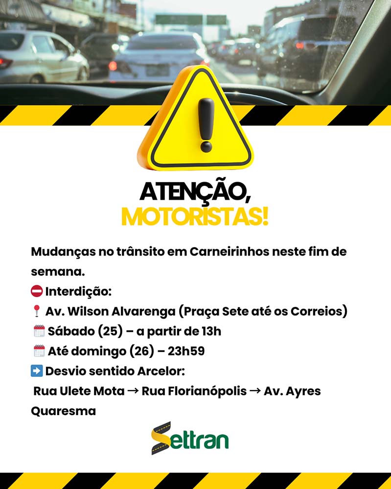 O Settran orienta que os condutores redobrem a atenção, respeitem a sinalização e, se possível, utilizem rotas alternativas para evitar transtornos.